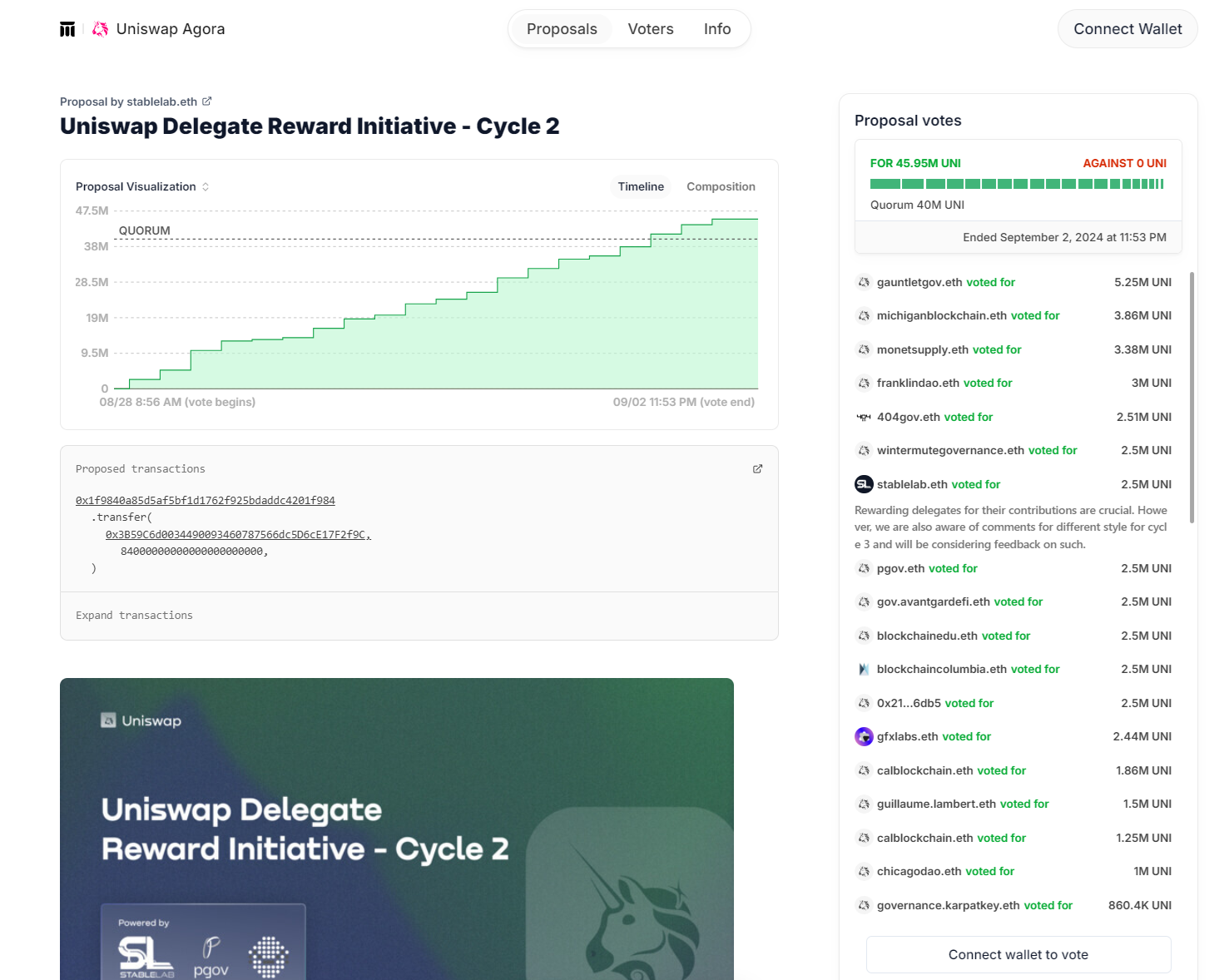 Once a proposal has reached the voting stage it represents real, executable code which will alter the functionality of Uniswap Governance or anything under its jurisdiction. Proper care should be taken to ensure that the code represented in the proposal has been audited and is found to be in good faith.