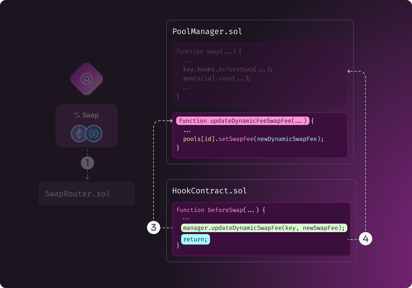 Unlike the static fee tiers in Uniswap v3 (0.05%, 0.30%, 1.0%) or the single fee in v2, dynamic fees in v4 offer much more flexibility. Dynamic fees can: